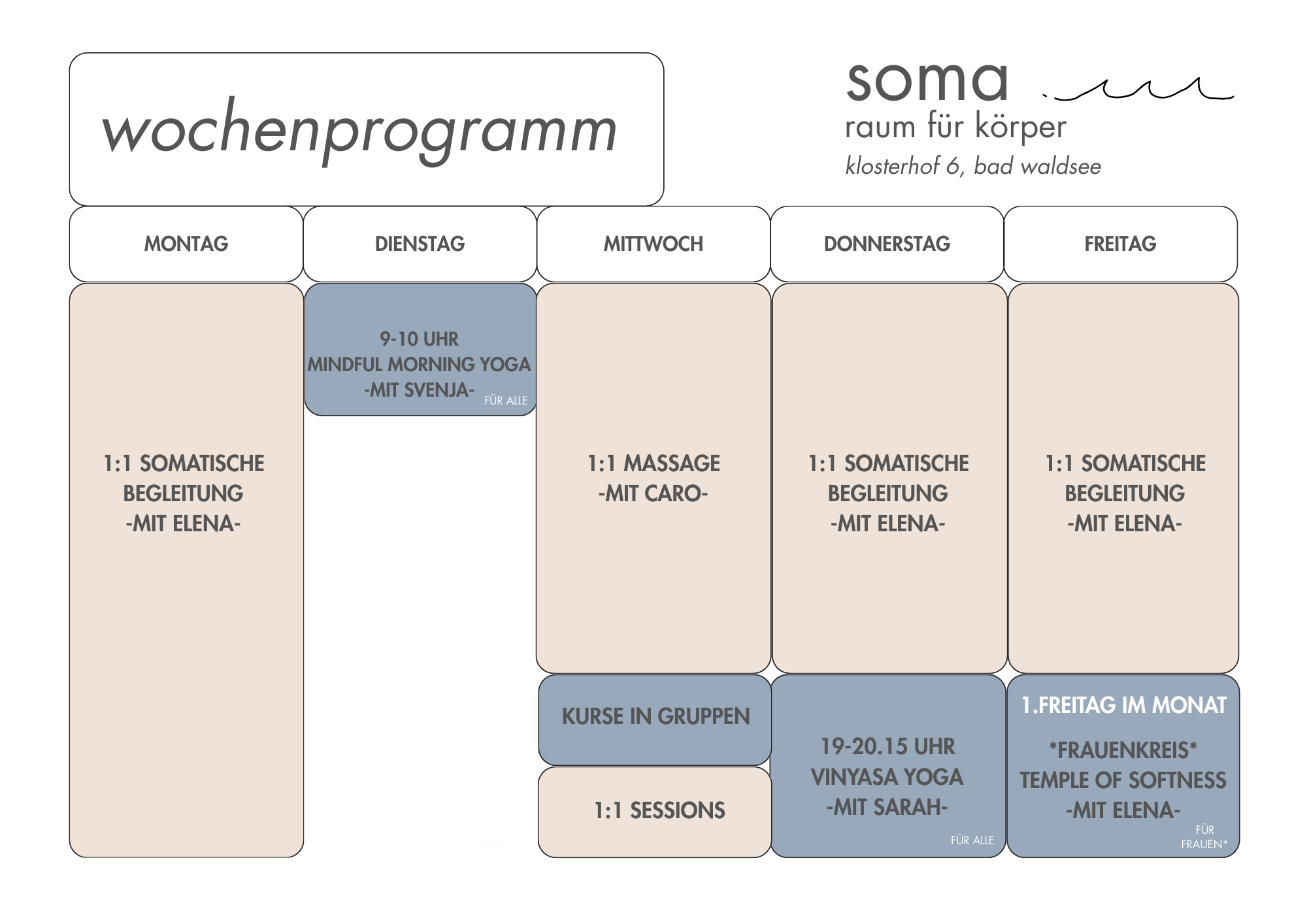 Aktuelle Infos zum Programm bekommst du am schnellsten in der s o m a Gruppe auf WhatsApp oder auf Instagram